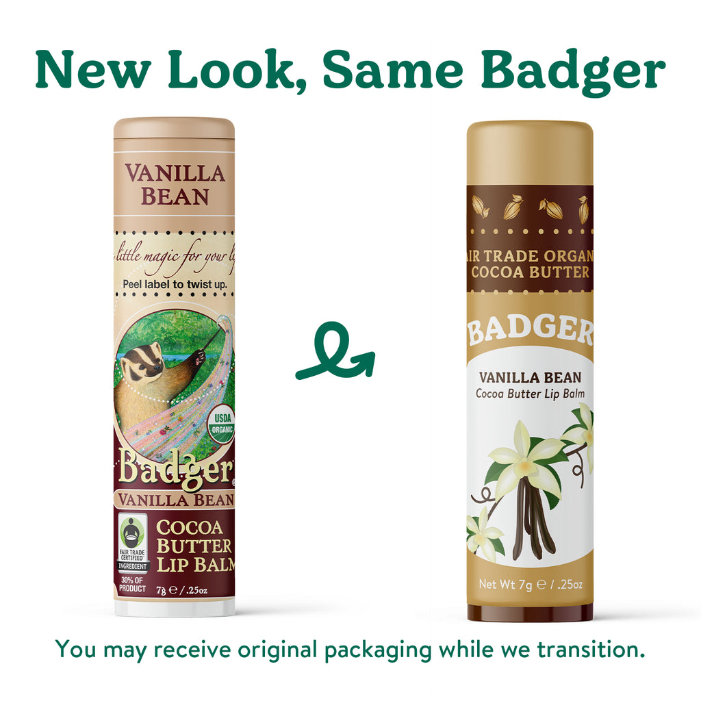 • Load image into Gallery viewer, vanilla bean cocoa butter lip balm new look, same badger