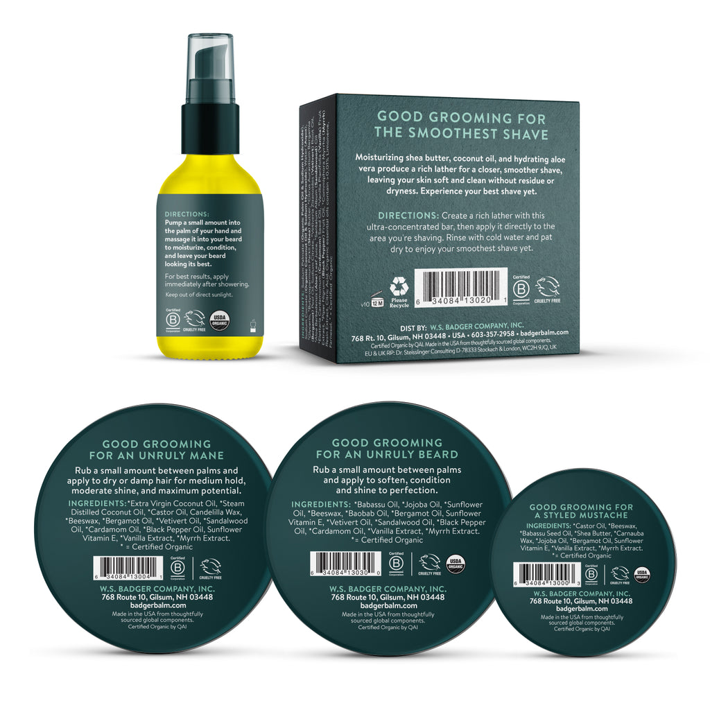 Enhance your daily grooming routine with our full collection of certified organic shaving and styling essentials. Made with nourishing, planet-friendly ingredients, each formula is designed to tame and smooth facial hair while moisturizing the skin underneath.